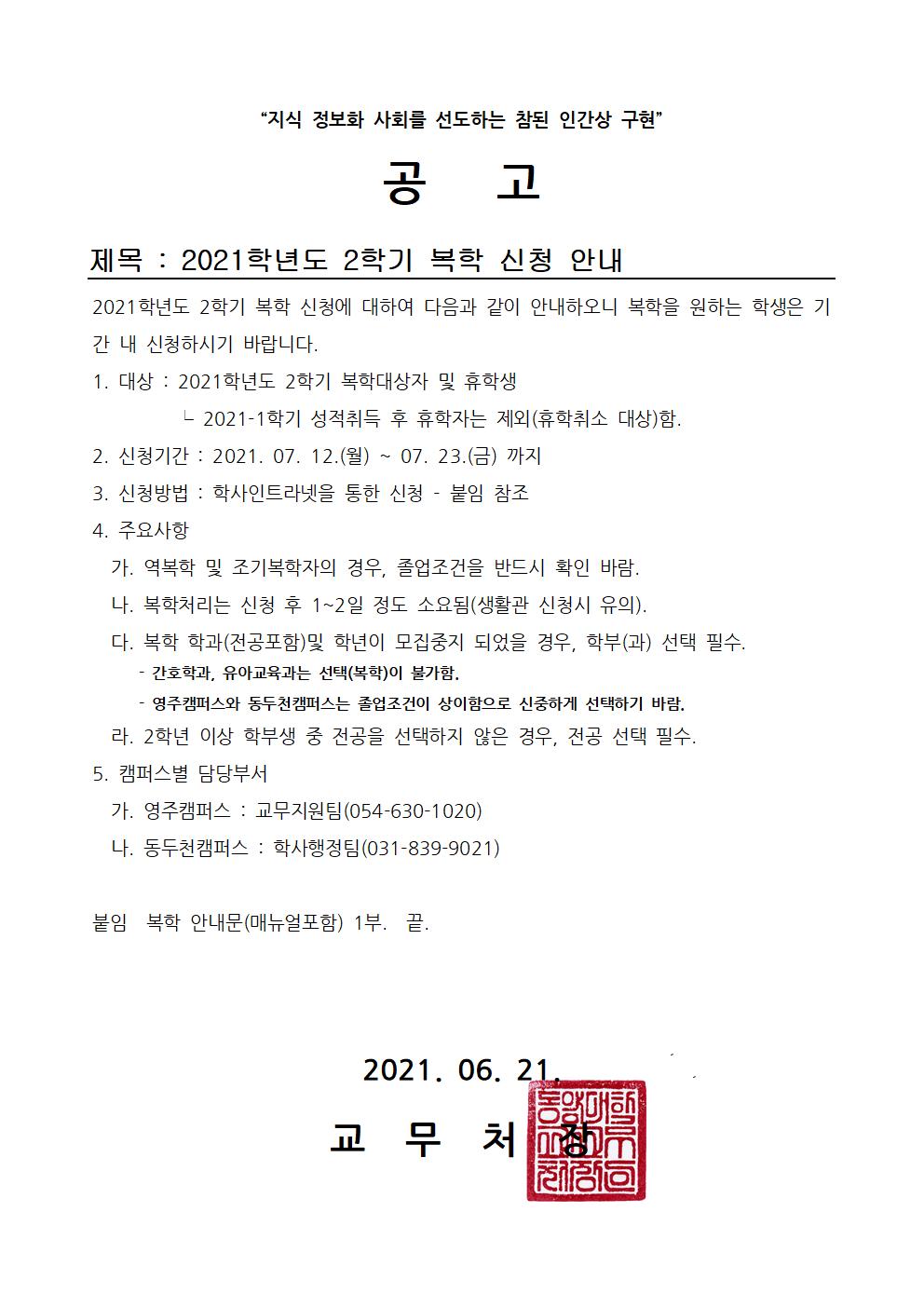 > 공지사항 > 2021학년도 2학기 복학신청안내