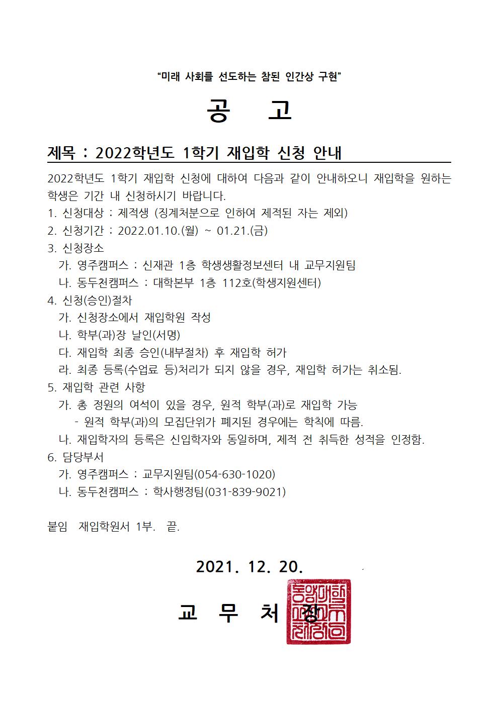 2022학년도 1학기 재입학 신청 안내