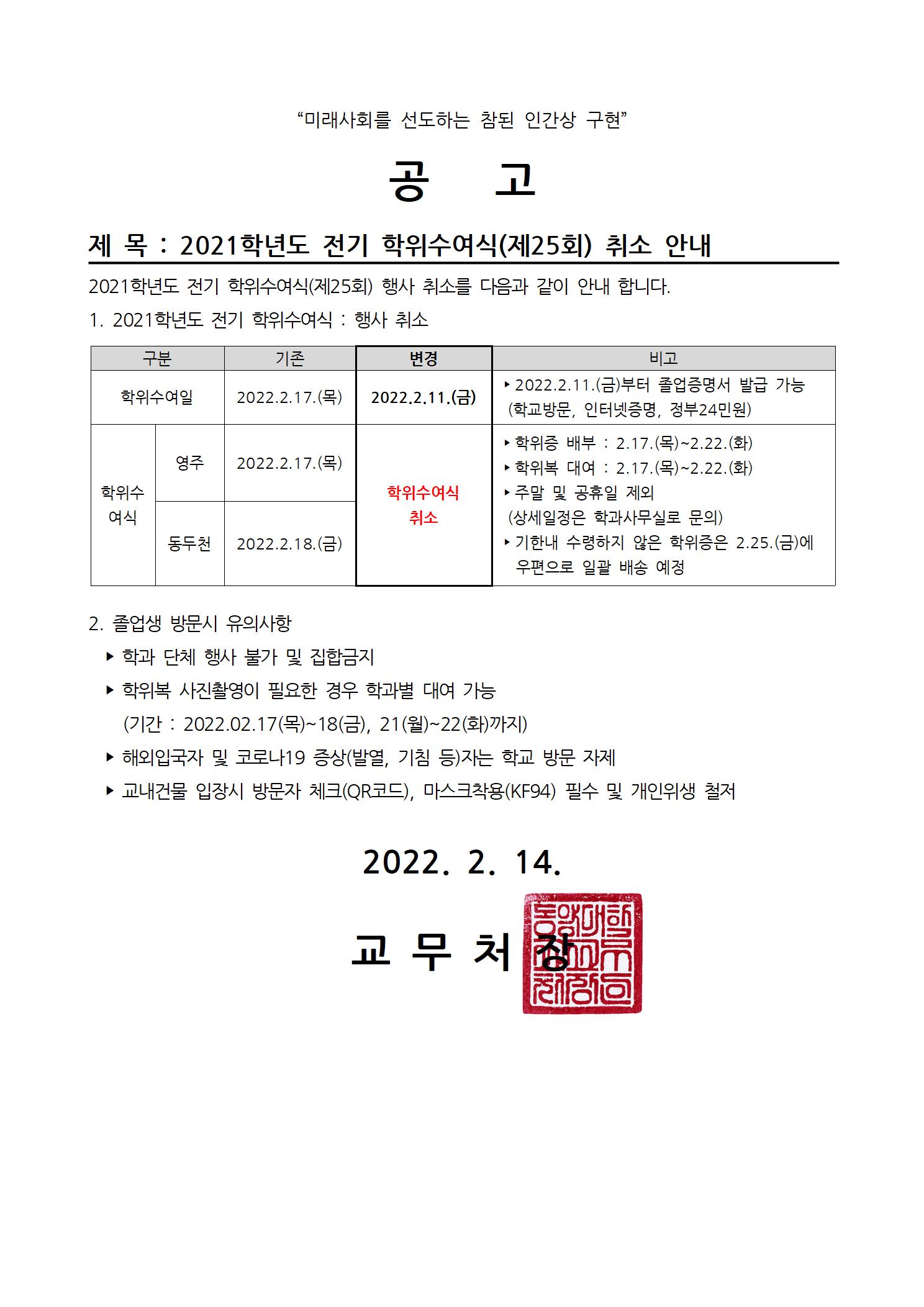 > 공지사항 > 2021학년도 전기 학위수여석(제25회) 취소 안내