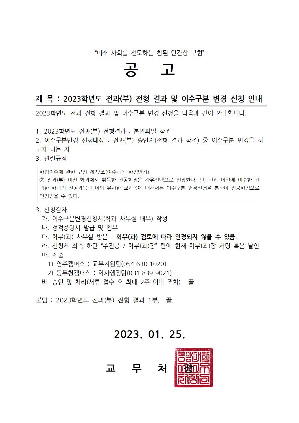 HOME > 공지사항 > 2023학년도 전과(부) 전형 결과 및 이수구분변경 신청 안내 공지사항 2023학년도 전과(부) 전형 결과 및 이수구분변경 신청 안내 공고붙임_전과부-전형-결과 목록보기