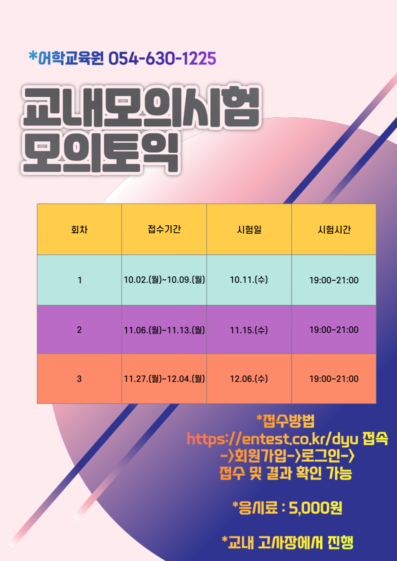 HOME > 공지사항 > 교내모의시험(모의토익, 모의토익스피킹)신청안내 공지사항 교내모의시험(모의토익, 모의토익스피킹)신청안내 https://www.dyu.ac.kr/plaza/news/talk-inform/?uid=7700&mod=document&pageid=1 목록보기