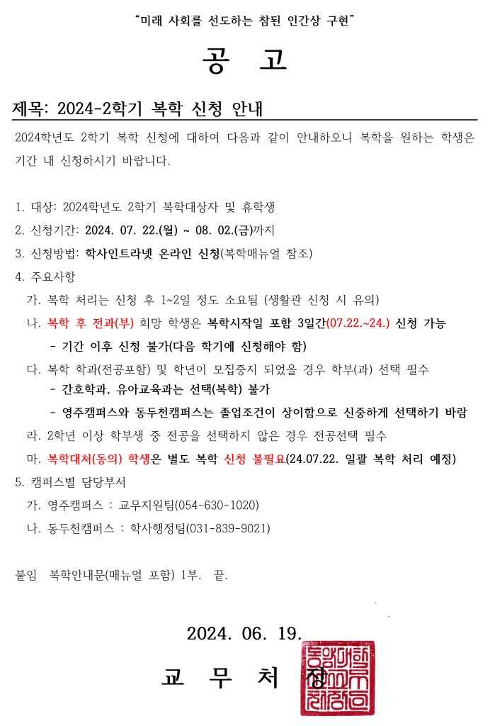 > 공지사항 > 2024-2학기 복학 신청 안내
