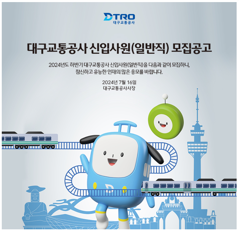 HOME > 취업정보 > 대구교통공사 신입사원(일반직) 모집 안내 취업정보 대구교통공사 신입사원(일반직) 모집 안내 2024년도 하반기 대구교통공사 신입사원(일반직)을 다음과 같이 모집하니, 참신하고 유능한 인재의 많은 응모를 바랍니다. 1. 회사명 : 대구교통공사 2. 기업형태 : 공기업 ⦁ 공공기관 ⦁ 공사 3. 모집부문 : 신입사원(일반직) 4. 자격요건 : 자세한 사항은 붙임 참고 2024년도-하반기-대구교통공사-신입사원일반직-모집공고문 직무기술서일반직 목록보기