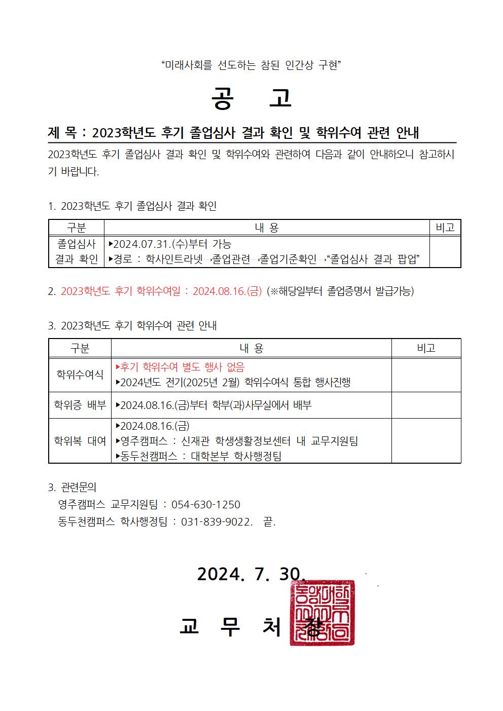 > 공지사항 > 2023학년도 후기 졸업심사 결과 확인 및 학위수여 관련 안내