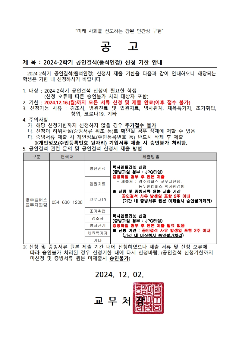 2024-2학기 공인결석(출석인정) 신청 기한 안내