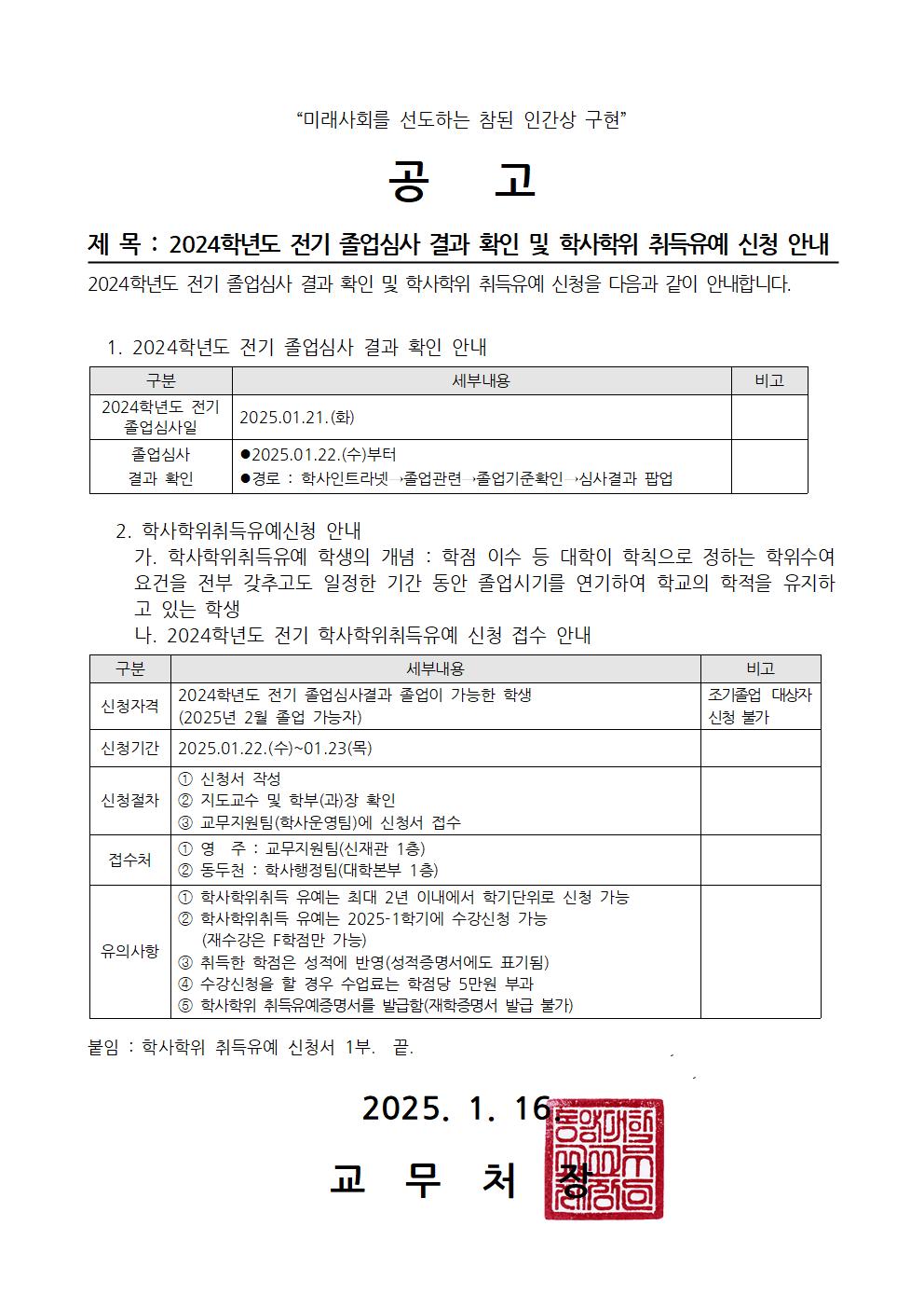 2024학년도 전기 졸업심사 결과 확인 및 학사학위취득유예신청 안내