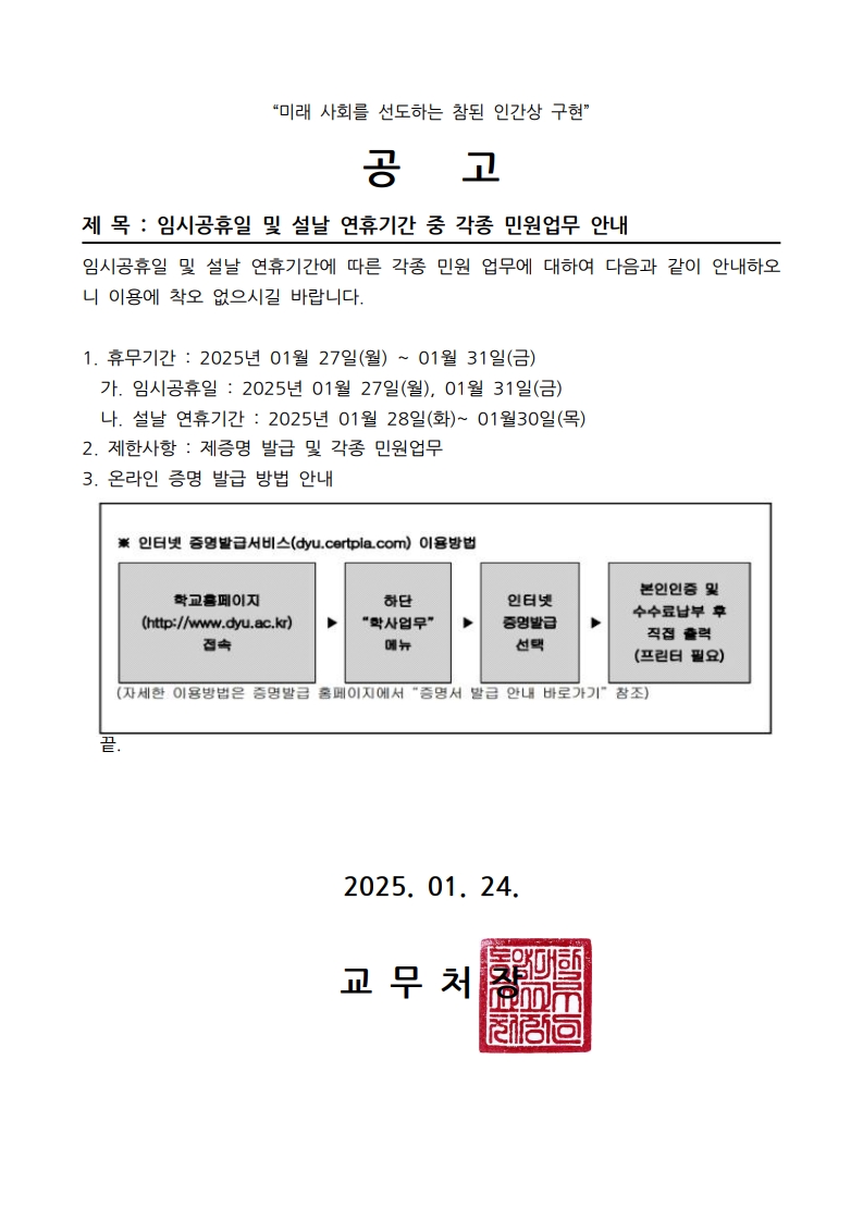 > 공지사항 > 임시공휴일 및 설날 연휴기간 중 각종 민원업무 안내