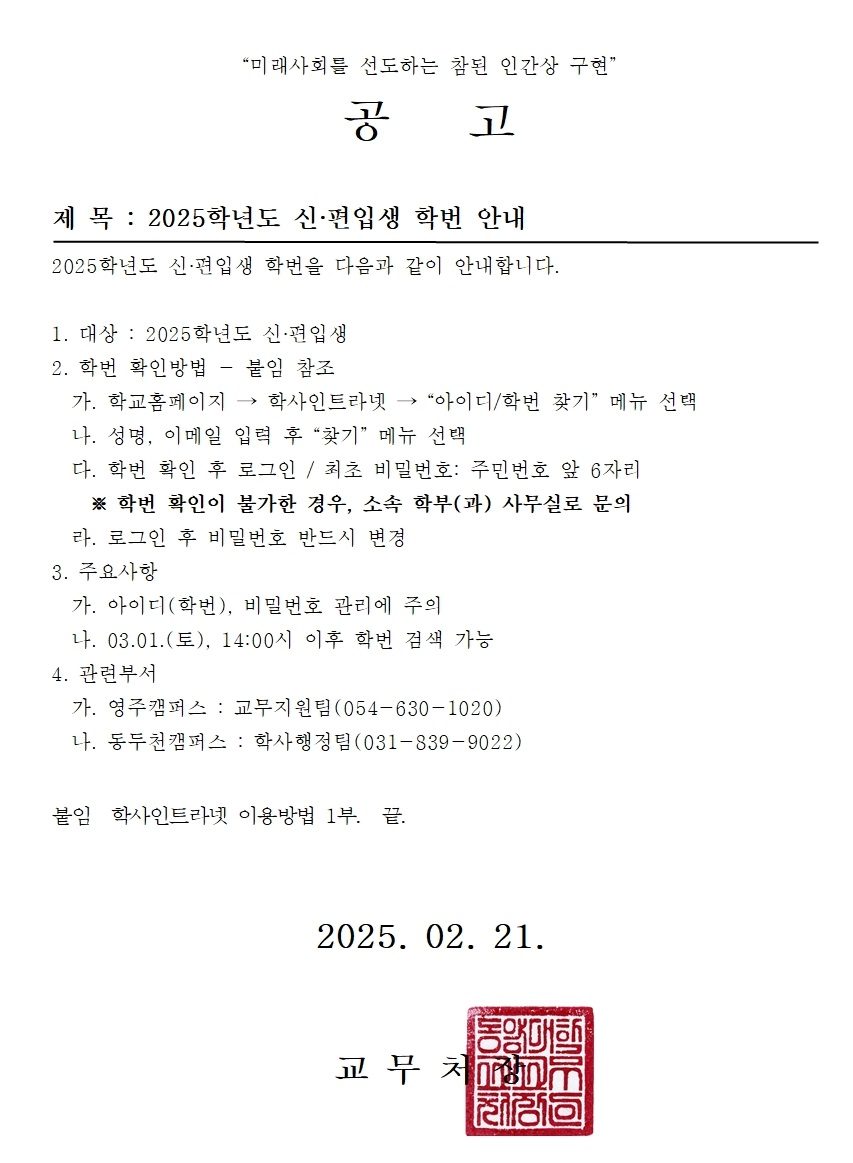 > 공지사항 > 2025학년도 신·편입생 학번 안내