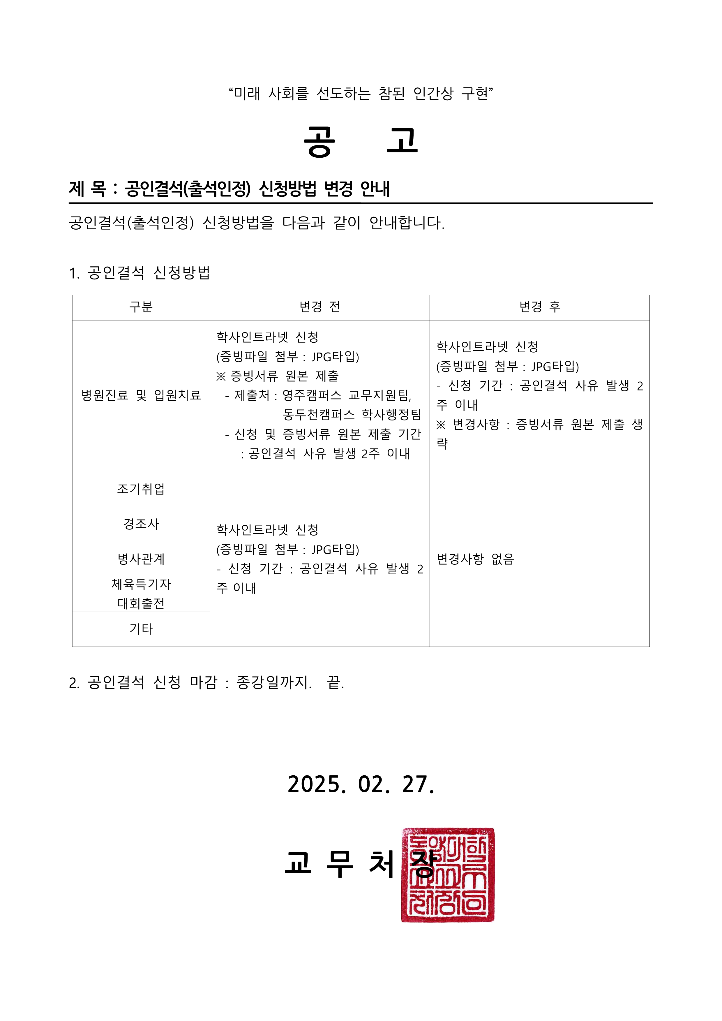 > 공지사항 > (공고) 공인결석(출석인정) 신청방법 변경 안내