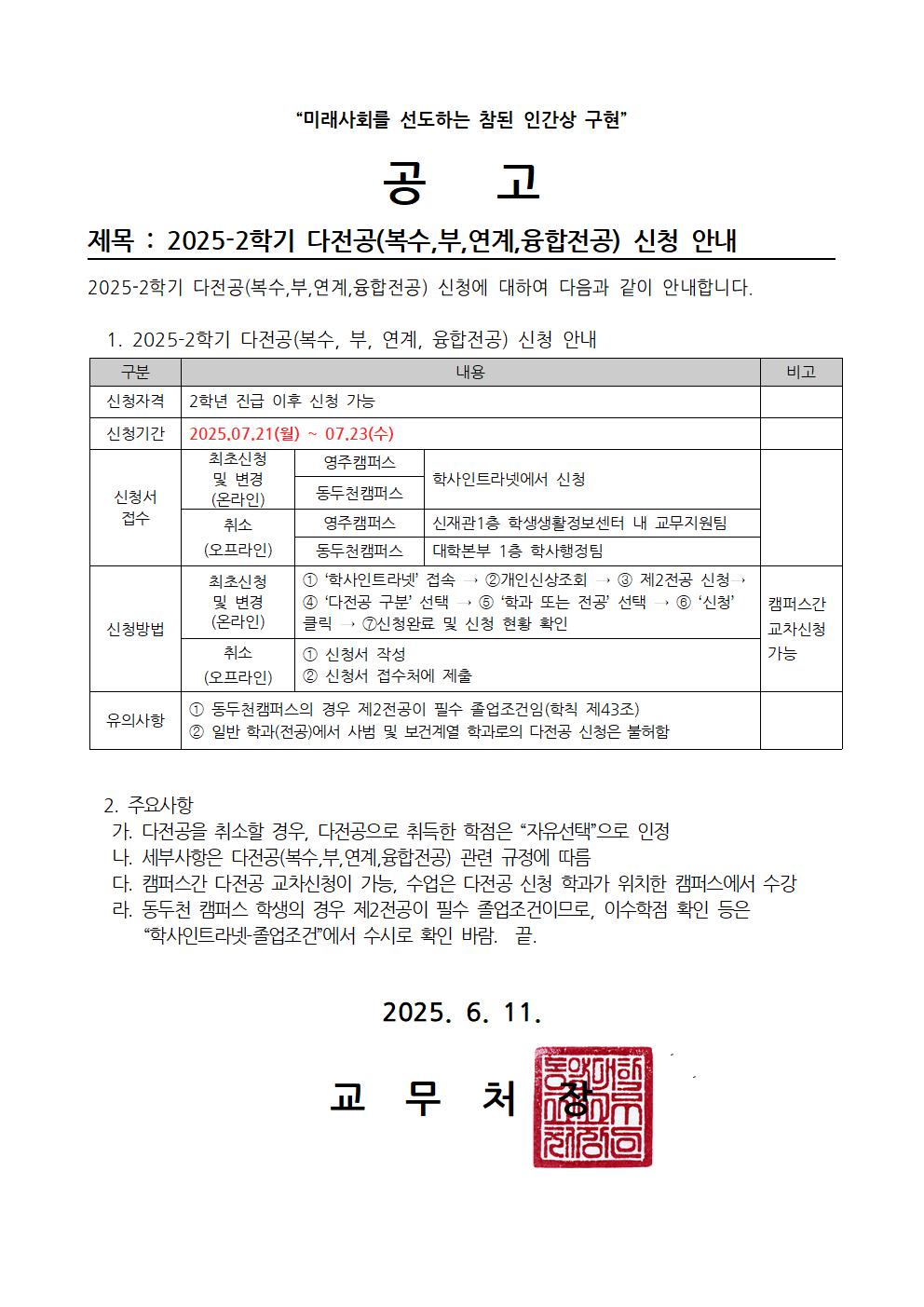 HOME   >   공지사항   >   2025-2학기 다전공(복수,부,연계,융합전공) 신청 안내
