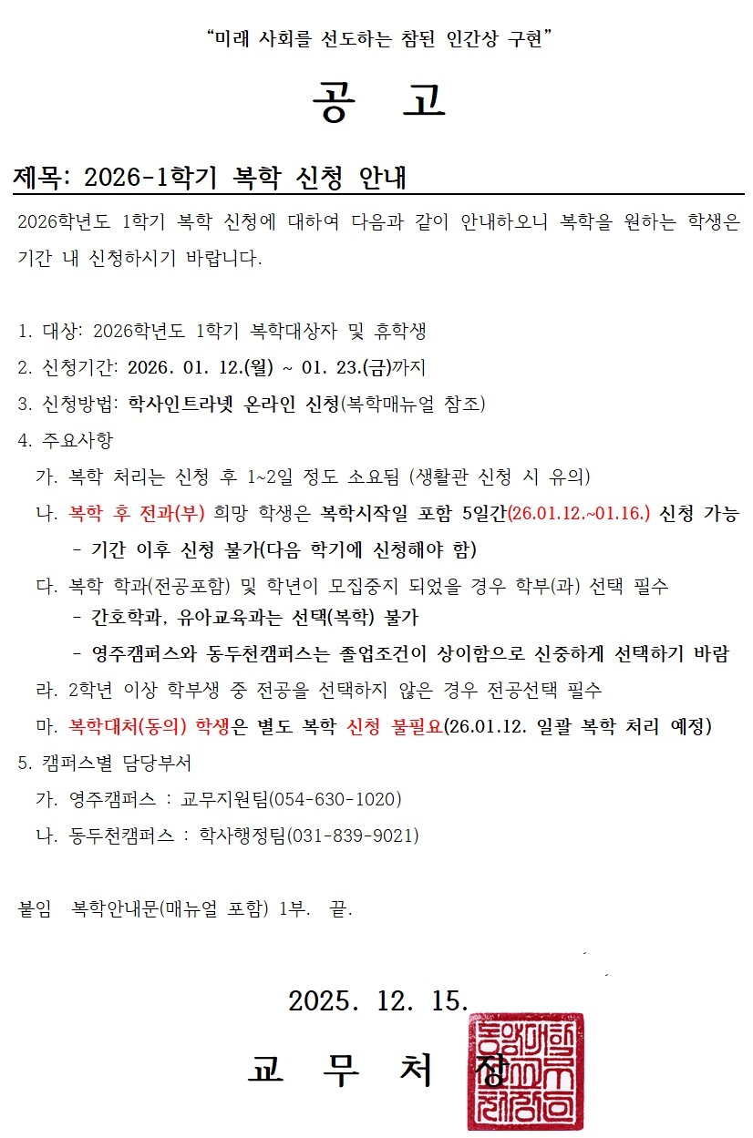 > 공지사항 > 2026-1학기 복학 신청 안내