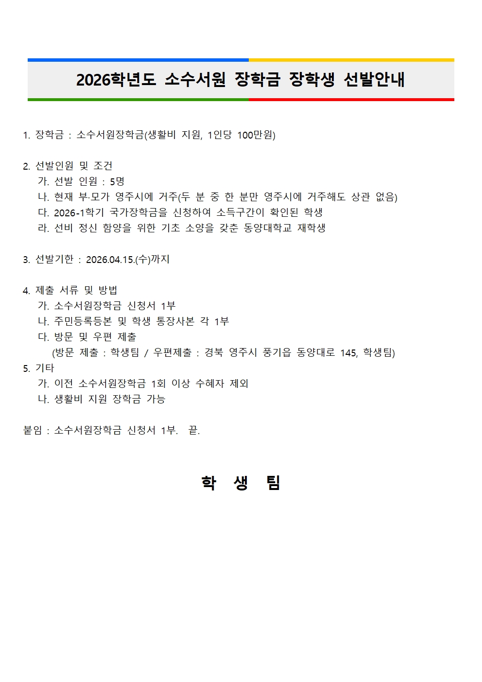 > 공지사항 > 2026학년도 소수서원 장학금 장학생 선발 안내